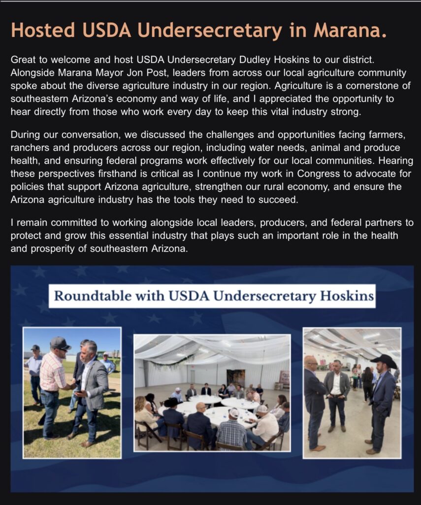 Juan loves his political theater. He is now bragging about all his meetings with the agricultural industry. But Juan has no real plans. He appears to be working counter to Arizona’s growth and prosperity strategy which involves using less water for agriculture in order to grow higher paying manufacturing and technology jobs. When was the last time Juan met with Pima County leadership or the Governor’s office?